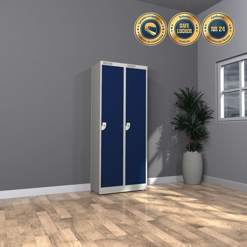 O Armário para Vestiário – 2 portas para Capacete – Nk 2331, com 2 portas e prateleiras internas, é a solução ideal para vestiários em empresas, indústrias e supermercados. Além disso, é especialmente eficiente como guarda-volumes, sendo perfeito para armazenar capacetes de motociclistas e outros itens pessoais. Fabricado com chapa galvanizada e pintura antimicrobiana, bem como trancamento triplo, oferece máxima segurança e durabilidade. Dessa forma, atende integralmente à NR 24, garantindo praticidade, sobretudo em ambientes que exigem organização e higiene.