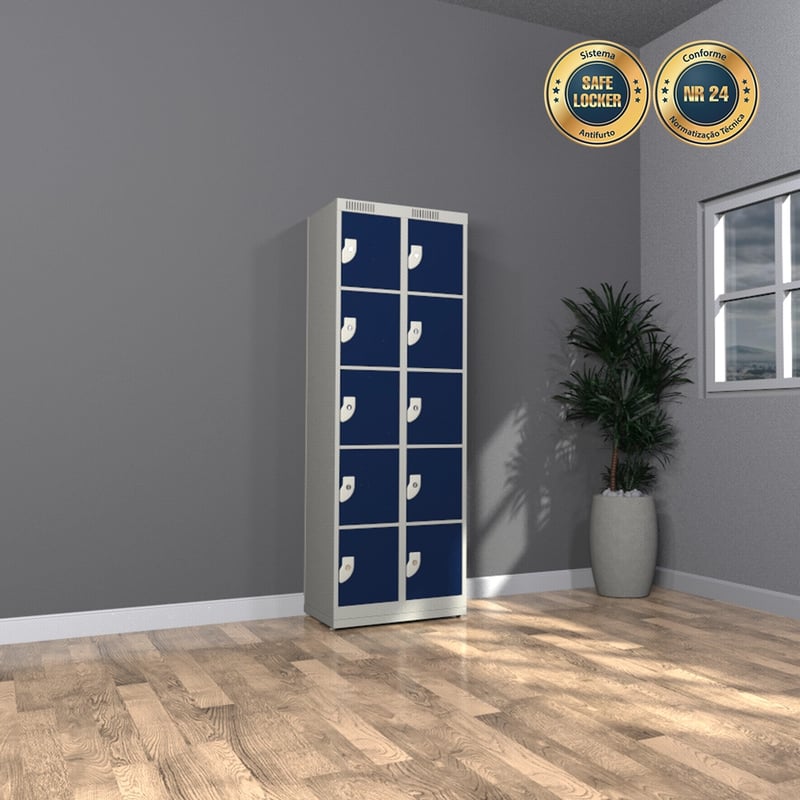 Este Armário é fabricado em aço galvanizado com tripla camada anticorrosiva. Assim, oferece maior durabilidade e resistência contra ferrugem. Conta com 10 portas individuais, o que garante armazenamento seguro e organizado. A pintura antimicrobiana e bactericida com nanotecnologia elimina odores e bactérias, contribuindo para ambientes mais higiênicos. Além disso, o sistema de ventilação integrado proporciona melhor circulação de ar. O design com dobras Hands Cut Free elimina arestas cortantes, aumentando a segurança. Também possui dobradiças reforçadas com 5 travas, que aumentam a resistência estrutural. O escudo anti-risco patenteado evita danos na pintura causados por chaves. Por fim, os pés ajustáveis permitem o nivelamento em pisos irregulares, facilitando a instalação.