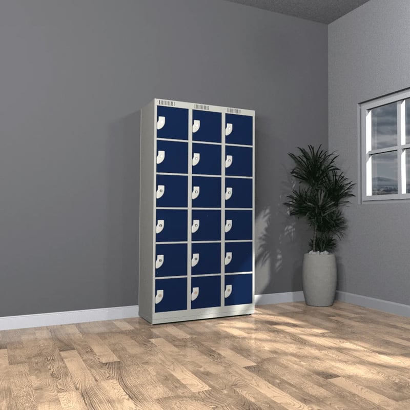 O modelo conta com 18 portas distribuídas em 3 colunas (6 por coluna), o que otimiza o espaço sem comprometer o volume de armazenamento. Além disso, apresenta design compacto e estrutura reforçada para garantir rigidez e segurança ao usuário.