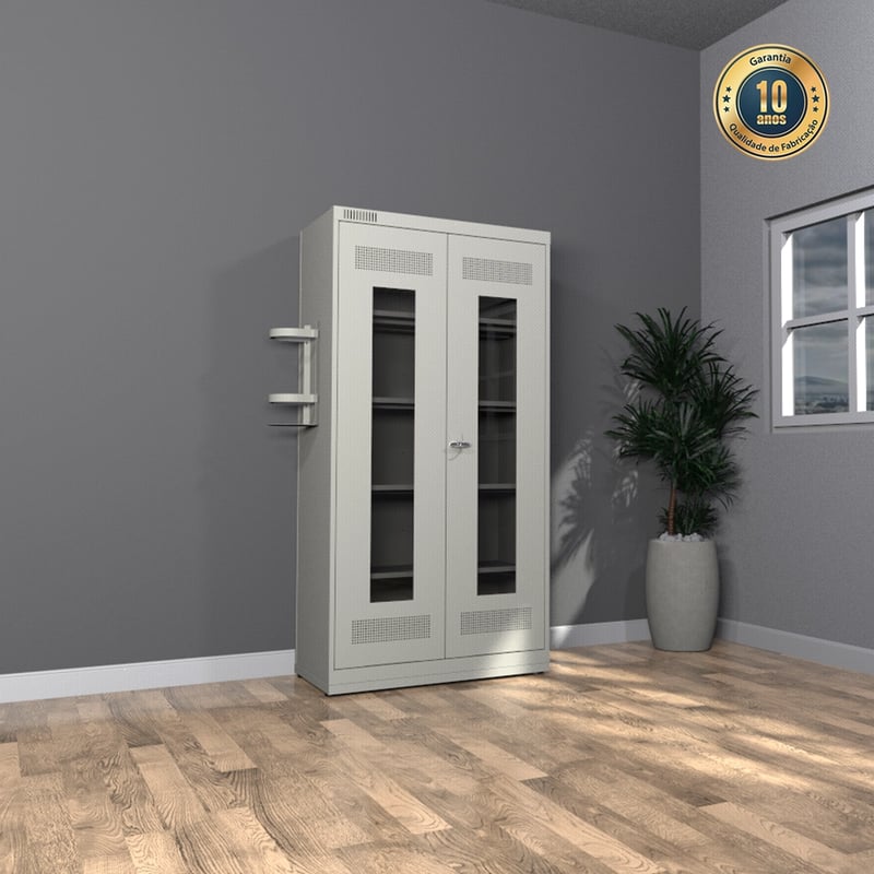 Enquanto o compartimento inferior com bandeja coletora garante o escoamento de líquidos, o suporte para extintor e o porta-documentos A4 oferecem maior segurança e controle de estoque. Quanto ao sistema de ventilação, as furações estampadas nas portas e no quadro frontal promovem a circulação de ar e, ao mesmo tempo, evitam o acúmulo de poeira. Além disso, a pintura epóxi-pó antimicrobiana proporciona higiene e facilidade na limpeza, enquanto o fecho tipo Cremona com trancamento triplo e as dobras Hand Cut Free garantem resistência e segurança.
