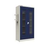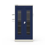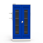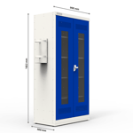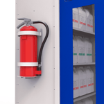 Enquanto o compartimento inferior com bandeja coletora garante o escoamento de líquidos, o suporte para extintor e o porta-documentos A4 oferecem maior segurança e controle de estoque. Quanto ao sistema de ventilação, as furações estampadas nas portas e no quadro frontal promovem a circulação de ar e, ao mesmo tempo, evitam o acúmulo de poeira. Além disso, a pintura epóxi-pó antimicrobiana proporciona higiene e facilidade na limpeza, enquanto o fecho tipo Cremona com trancamento triplo e as dobras Hand Cut Free garantem resistência e segurança.