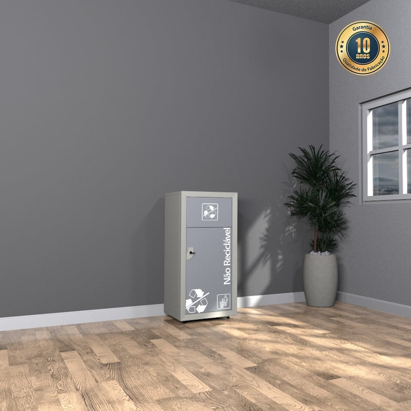 Na versão com identificação “Não Reciclável”, a Lixeira Reciclável Seletiva em Aço 70L possui acabamento na cor cinza e sinalização impressa na porta, auxiliando na padronização visual da coleta seletiva e no descarte correto pelos usuários.