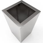 Além disso, seu design funcional elimina a necessidade de porta frontal, permitindo que a retirada do saco seja feita pela parte superior, facilitando assim a manutenção. Graças ao acabamento refinado e à proteção anticorrosiva, essa lixeira mantém sua aparência impecável mesmo sob uso frequente ou em condições mais agressivas.