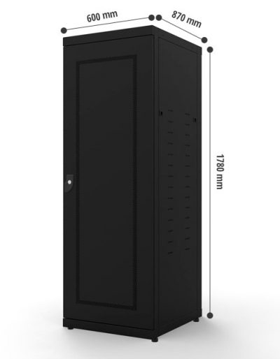 O RACK 19″ 36Us se destaca por suas dimensões de 600mm de largura, 1642mm de altura útil e 870mm de profundidade, em conformidade com as normas EIA-310 e RS-310. Sua estrutura é construída com chapa pré-zincada de 1,25mm, incorporando réguas horizontais e verticais de 2mm entre réguas de 700mm. Oferece a opção de uma porta frontal em 1,25mm com vidro temperado transparente de 5mm, assim como uma porta traseira em 1,25mm com chapa perfurada sextavada de 5mm. As laterais apresentam venezianas em chapa pré-zincada de 0,8mm. Este rack desmontável tem uma altura total de 1780mm e uma carga máxima de 600kg sem rodízios, destacando-se sobretudo pela sua pintura em epóxi em pó preto microtexturizado RAL9011.