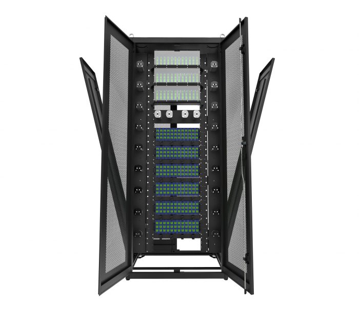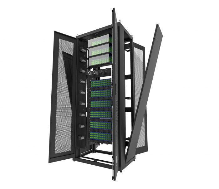 RACK FIBRA ÓTICA de Alta Densidade contendo 45U com 23″ e adaptadores para 19″ para uso interno. O sistema compreende um bastidor que pode armazenar Shelfs DGO, Shelf Splitter e cartões DGO e Splitter.