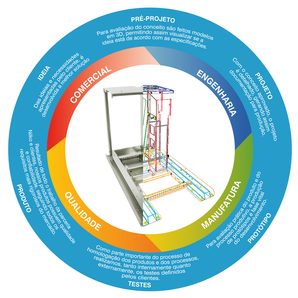 Estamos respaldados por plantas fabris com diversos processos de produção, know-how de engenharia na realização de projetos e testes (conforme normas e laboratórios nacionais e internacionais). Nossa estrutura foi concebida para atender aos clientes conforme suas necessidades, desde a fase de criação dos Produtos até a distribuição para mercado, incluindo a validação técnica e dos processos de produção, garantindo assim a repetibilidade. Além de nossa equipe técnica e recursos tecnológicos próprios, como equipamentos e softwares, temos convênios firmados com universidades e institutos de pesquisa, atendendo assim todas as etapas do processo produtivo no modelo One Stop Shop, outsourcing, OEM e desenvolvimento completo de produtos.